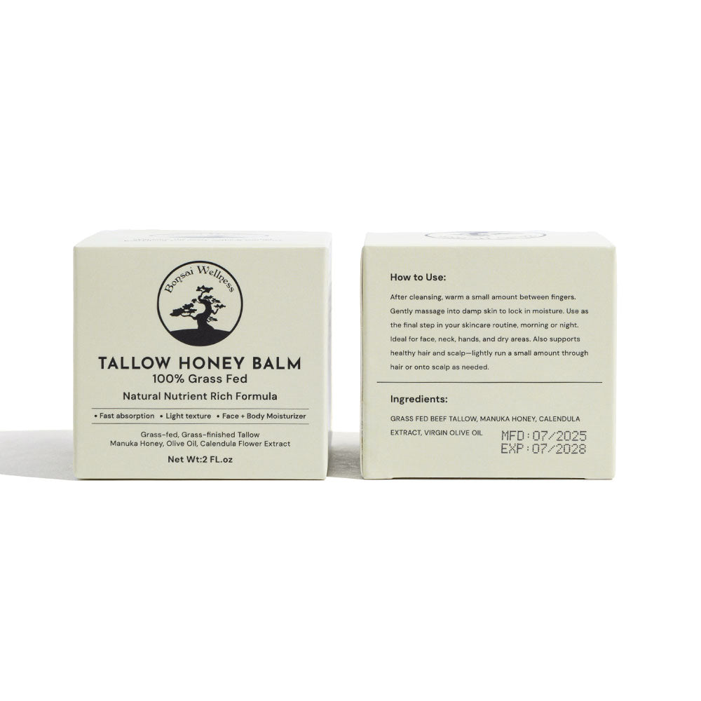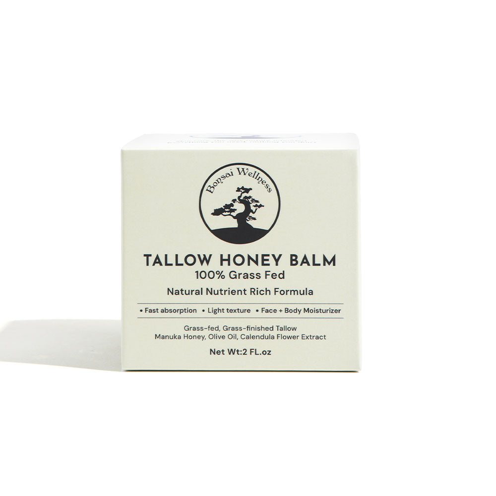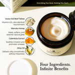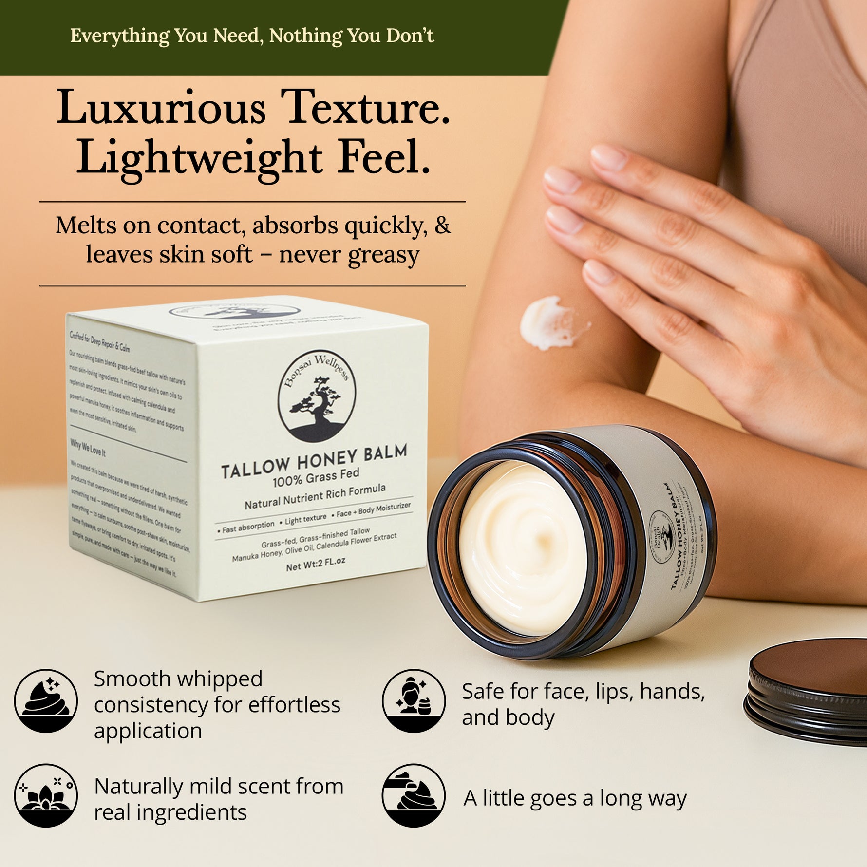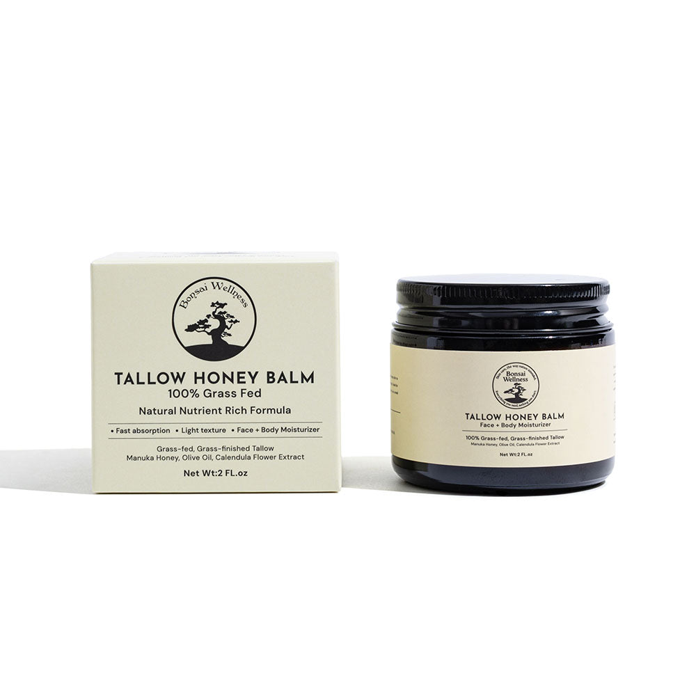 Our Beef Tallow Honey Balm is a deeply nourishing, all-in-one moisturizer crafted from four powerhouse ingredients — grass-fed beef tallow, manuka honey, calendula extract, and virgin olive oil. Together they mimic your skin’s natural oils to hydrate, calm, and restore balance without harsh synthetics or fillers.