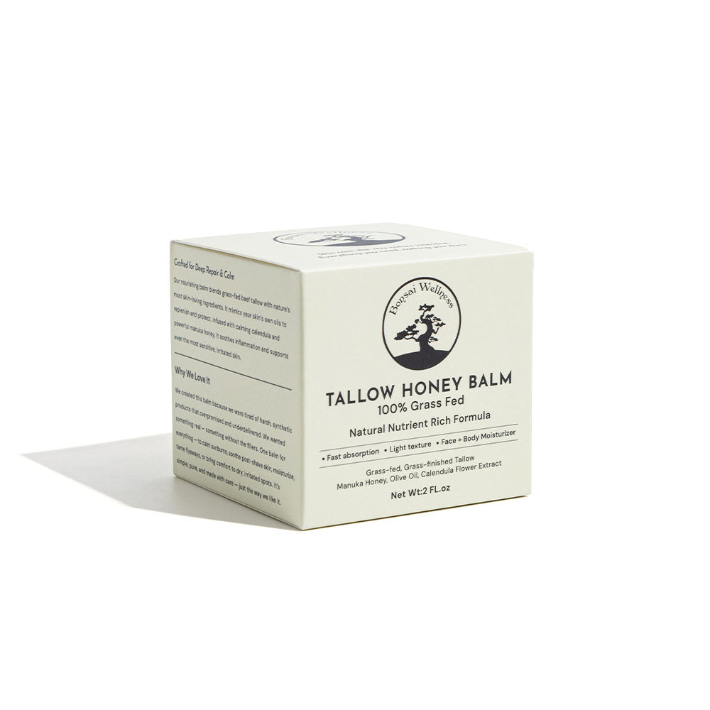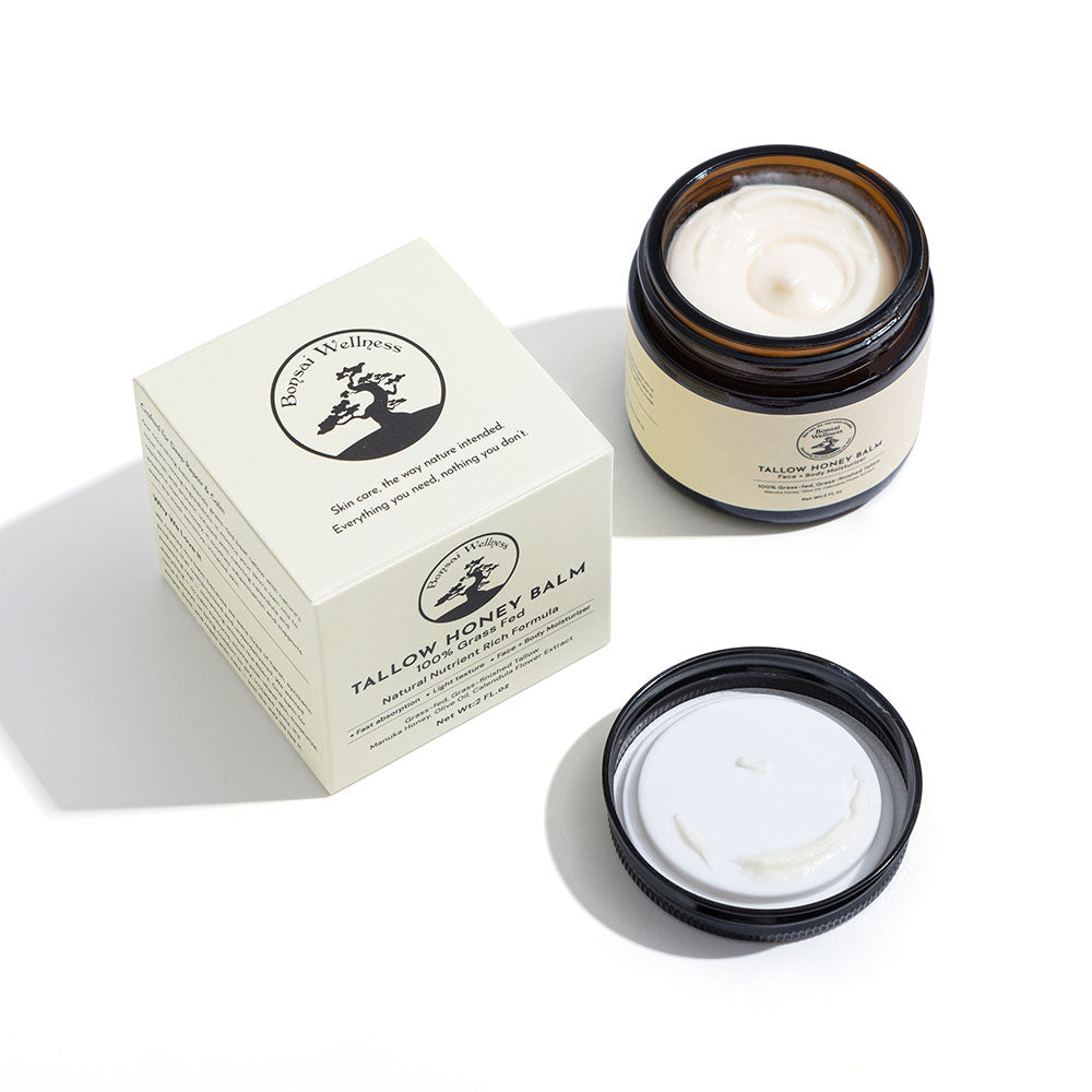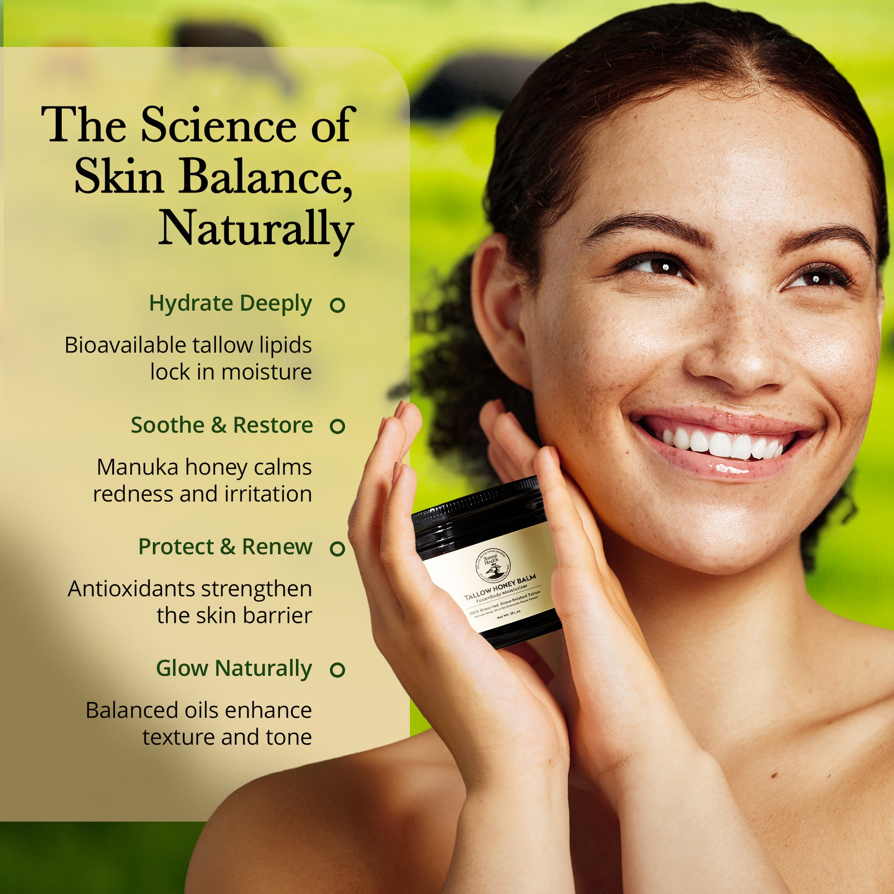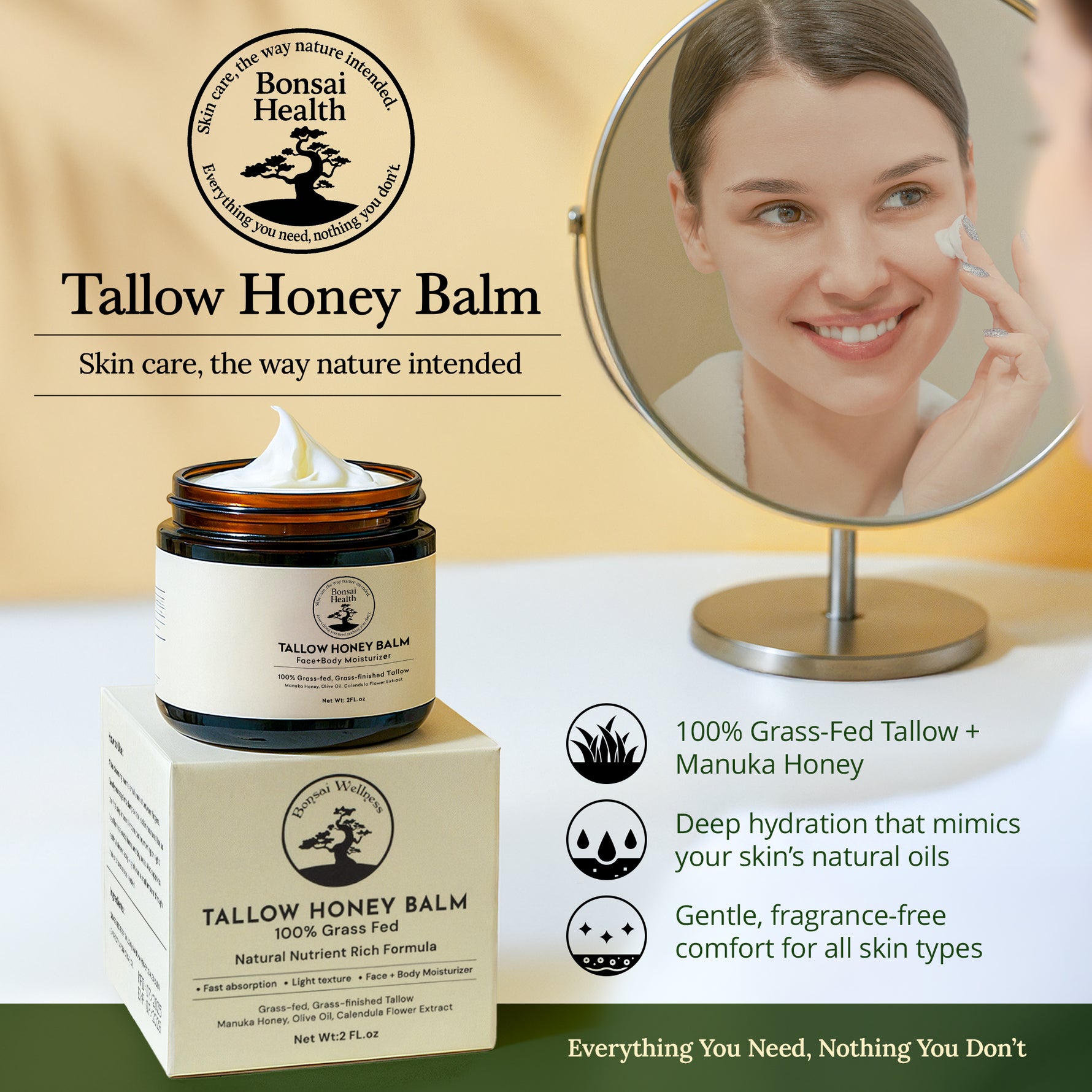 Our Beef Tallow Honey Balm is a deeply nourishing, all-in-one moisturizer crafted from four powerhouse ingredients — grass-fed beef tallow, manuka honey, calendula extract, and virgin olive oil. Together they mimic your skin’s natural oils to hydrate, calm, and restore balance without harsh synthetics or fillers.