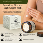 Scoop out a small amount (a pea-size goes a long way) and warm it between your fingers until it softens. Gently massage into clean, slightly damp skin. Use it anywhere you need moisture — face, hands, lips, elbows, or even to soothe irritation after shaving or sun exposure.